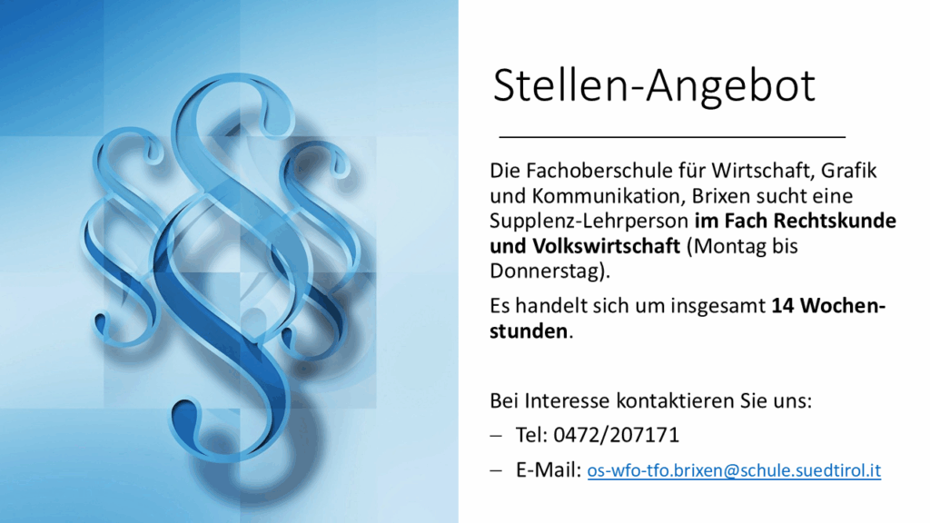 Stellenangebot - Lehrperson für Rechtskunde und Volkswirtschaft
